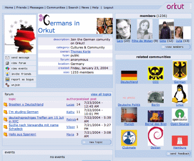 Orkut bietet tausende von Communities (Gemeinschaften) zu allen möglichen Themen, deren Kernstück das jeweilige Diskussionsforum ist (glücklicherweise ist es in den meisten Foren sehr ruhig, sodaß man weiterhin Zeit für andere Dinge hat :-)). In jeder Community sieht man alle Personen (Foto und Name), die diese abonniert haben. Mit einem Klick auf eine Person kann man wieder mehr über sie und ihre Freunde erfahren.