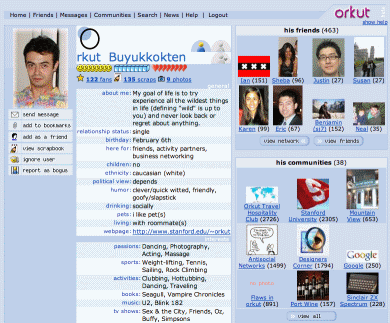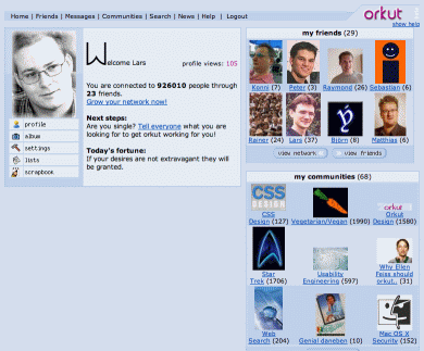 Hat man in Orkut Freunde gefunden oder Freunde, die noch nicht in Orkut waren, eingeladen, kann man ein Netzwerk von Freunden und Freundesfreunden betrachten. Man sieht, welche Freunde die eigenen Freunde haben, und deren Freunde, usw. Bei jeder Person sieht man außerdem neben den persönlichen Angaben, welche Communities diese abonniert hat und somit, für welche Themen sie sich interessiert. So ist es möglich, neue Bekanntschaften nach seinen Interessen zu schließen.